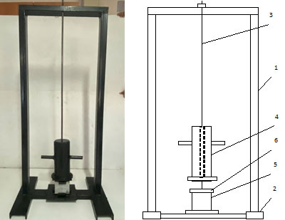 1-П-тәрізді тірек жақтауы; 2 - тірек бөлігі; 3 - бағыттаушы білік; 4 – қаққыш; 5 - сынақ үлгісі; 6 - тірек тақталары.