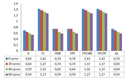- 20, 40 және 60 тәулікке тең сумен қанықтыру кезеңінде соққы беріктігінің шегі төмендеді: FC, FPCMR және FPCPP үлгілерінде-тиісінше 4, 7 және 11%; Ke үлгілерінде – 7, 14 және 20%; ал FMR және FPP үлгілерінде қажетті сипаттаманың 14 және 20% төмендеуі% үлгілерді 40 және 60 тәулікте сумен қанықтыру кезінде анықталды.