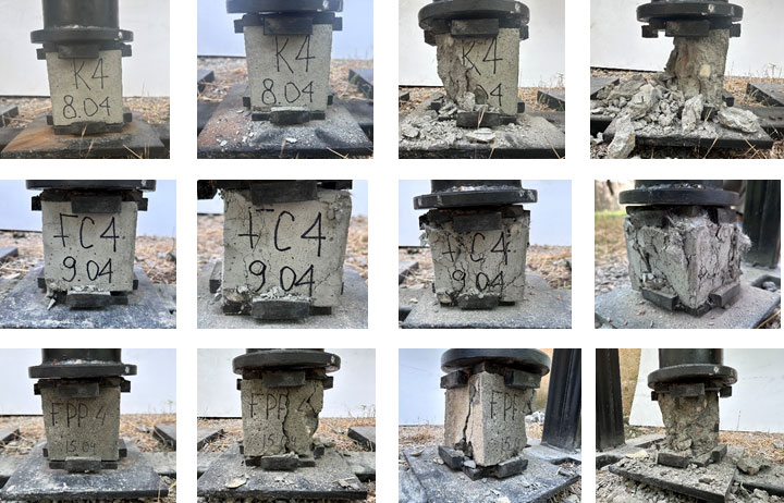 4-сурет - Бетон үлгілерін соққы жүктемелерімен сынау және бұзу фрагменттері: а) бастапқы күй; ә) зақымданудың басталу кезеңі; б) үдемелі жойылу кезеңі; в) толық жойылу кезеңі.
