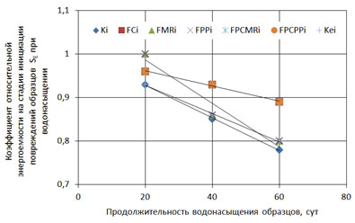 5-сурет - бетон үлгілерінің зақымдана бастау сатысындағы салыстырмалы энергия сыйымдылығы коэффициентінің судың қанығу ұзақтығына тәуелділігі