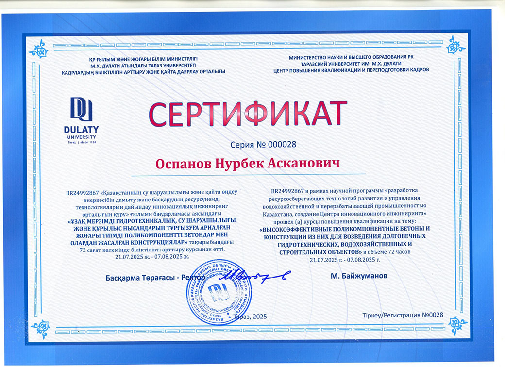 Атап айтқанда, 2025 жылдың 21 шілдесі мен 7 тамыз аралығында М.Х. Дулати атындағы Тараз университетінде Жамбыл облысы мен Тараз қаласының құрылыс саласындағы өнеркәсіптік кәсіпорындары, мемлекеттік органдары мен жобалау мекемелерінің мамандарына арналған қысқа мерзімді оқыту курсы өткізілді. Курс тыңдаушыларының арасында Жамбыл облысы әкімдігінің Сәулет және қала құрылысы басқармасының мамандары, ҚазСҚҒЗИ АҚ ОҚФ ғылыми-зерттеу институтының сарапшылары, Қазақ ұлттық су шаруашылығы және ирригация университетінің оқытушылары, «Сейсмотұрақты құрылыс сараптамасы», «СтройТехЭкспертиза», «СтройСнабТехМонтаж», «Qaztehnadzor-ALI» жобалау мекемелерінің өкілдері, «Ғимарат Темірбетон» зауыты, «Бином» құрылыс-монтаждау компаниясы сияқты өндірістік кәсіпорындардың басшылық және инженерлік-техникалық мамандары қатысты. Курс жұмысын ұйымдастыруға университет ғалымдары – Бекбасаров И.И., Сағындыков А.А., Нурпеисов С.К., Баялиева Г.М., Карабаев Н.Т., Шаншабаев Н.А., Атенов Е.И. өз үлестерін қосты. Университет ректорының м.а. Кабдушев А.А. тыңдаушыларға университет ғылымының жетістіктері туралы шолу жасап, ғылыми ізденістердің келешегі жайлы университет жоспарларымен таныстырды.